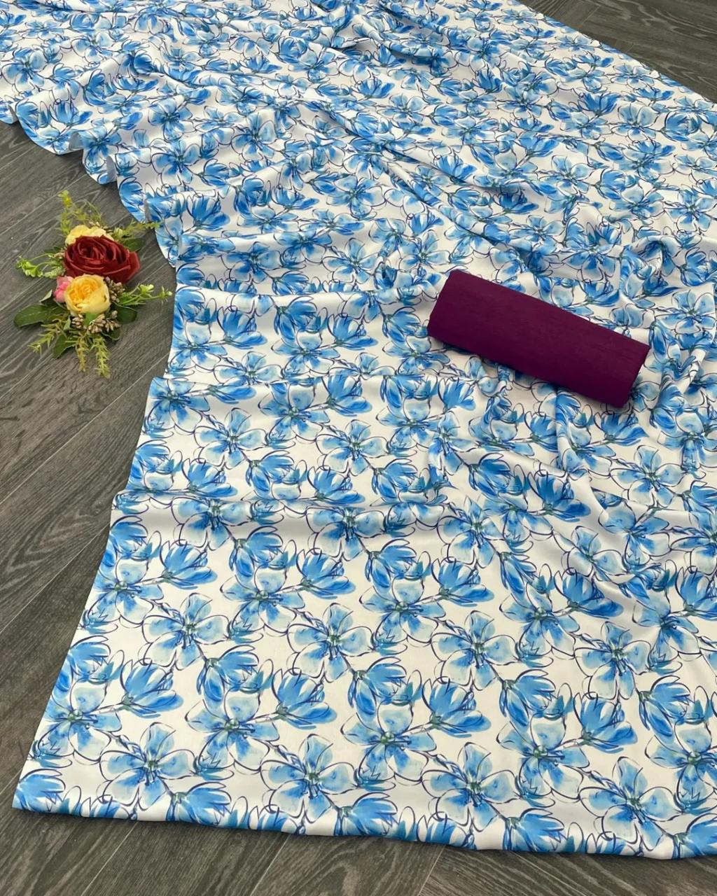 Turn heads with our Elegant Lavender Floral Printed Georgette Saree, a perfect blend of charm, grace, and modern aesthetics. Designed for women who love lightweight comfort with traditional beauty, this saree features a soft georgette fabric adorned with vibrant pink and white floral prints that exude elegance.