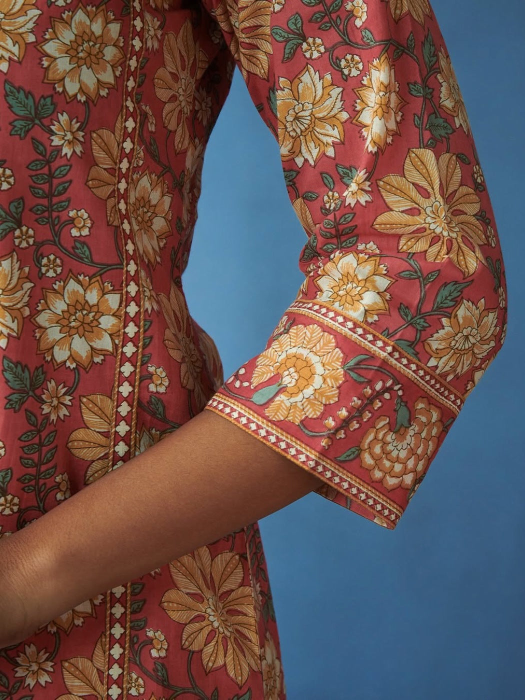 - Elegant printed kurta in earthy tones with a regal floral touch
