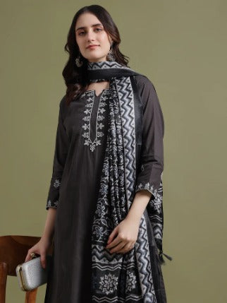 Elevate your ethnic wardrobe with the FlexFeb Vertigan Black 3-Piece Suit Set, beautifully detailed with minimalist white embroidery that adds a refined touch to its rich, dark base. This versatile and timeless black suit, enhanced with striking white linear embroidery, is crafted for the modern woman who values elegance and comfort in equal measure.