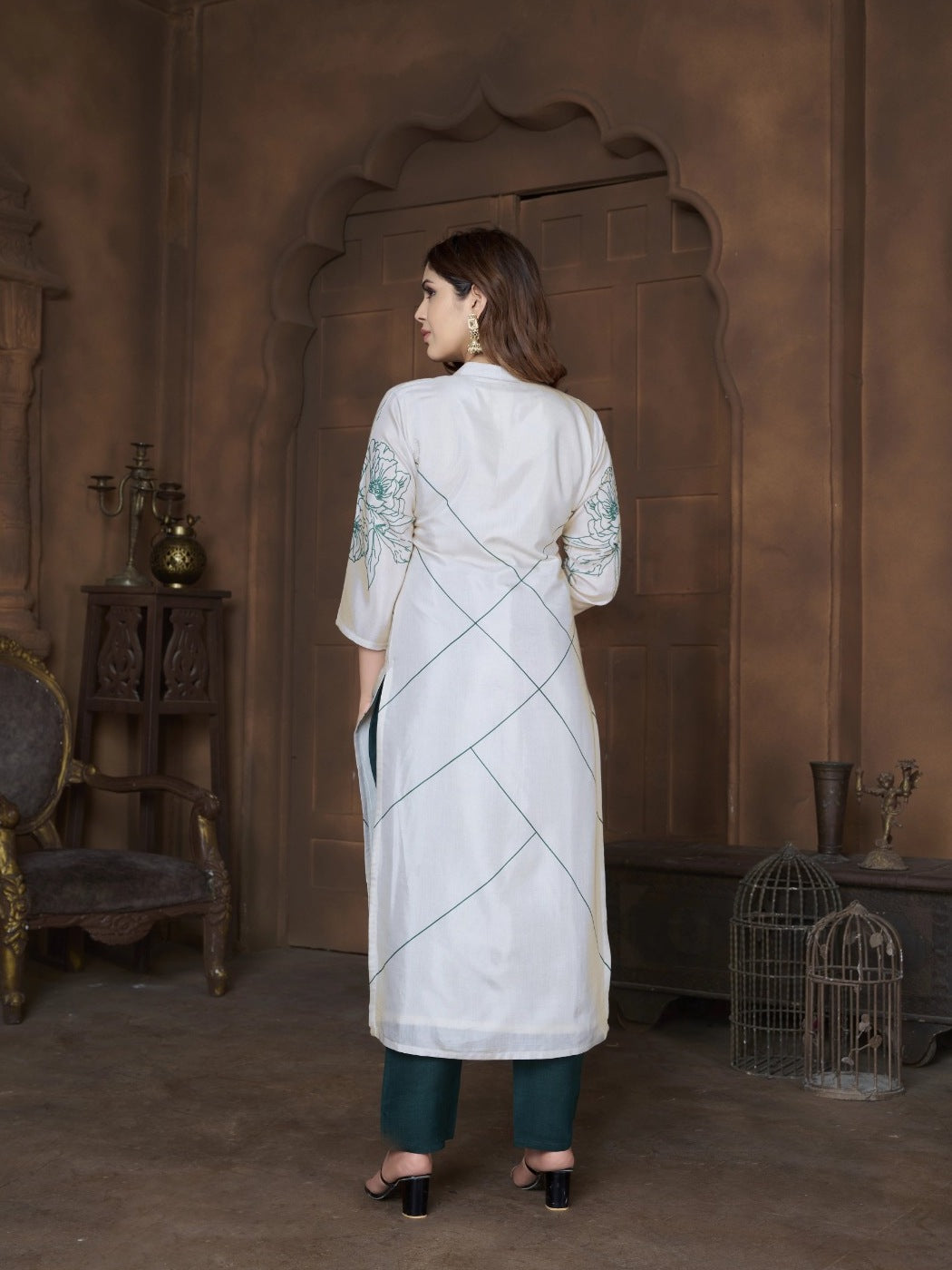 - 🪡 Kurta: Structured kurta with contrast floral yoke & sleeve pattern