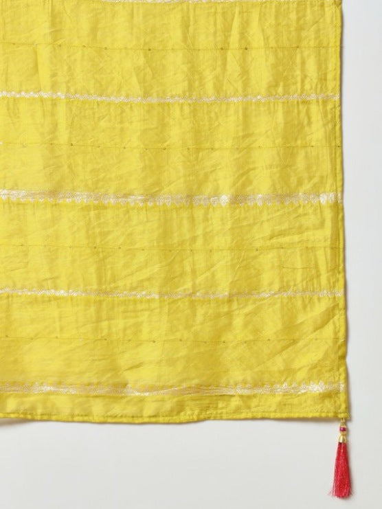 FlexFeb Elegant Jacquard Yellow 3-Piece Suit Set with Silver Line Detailing & Embroidered Neck Design