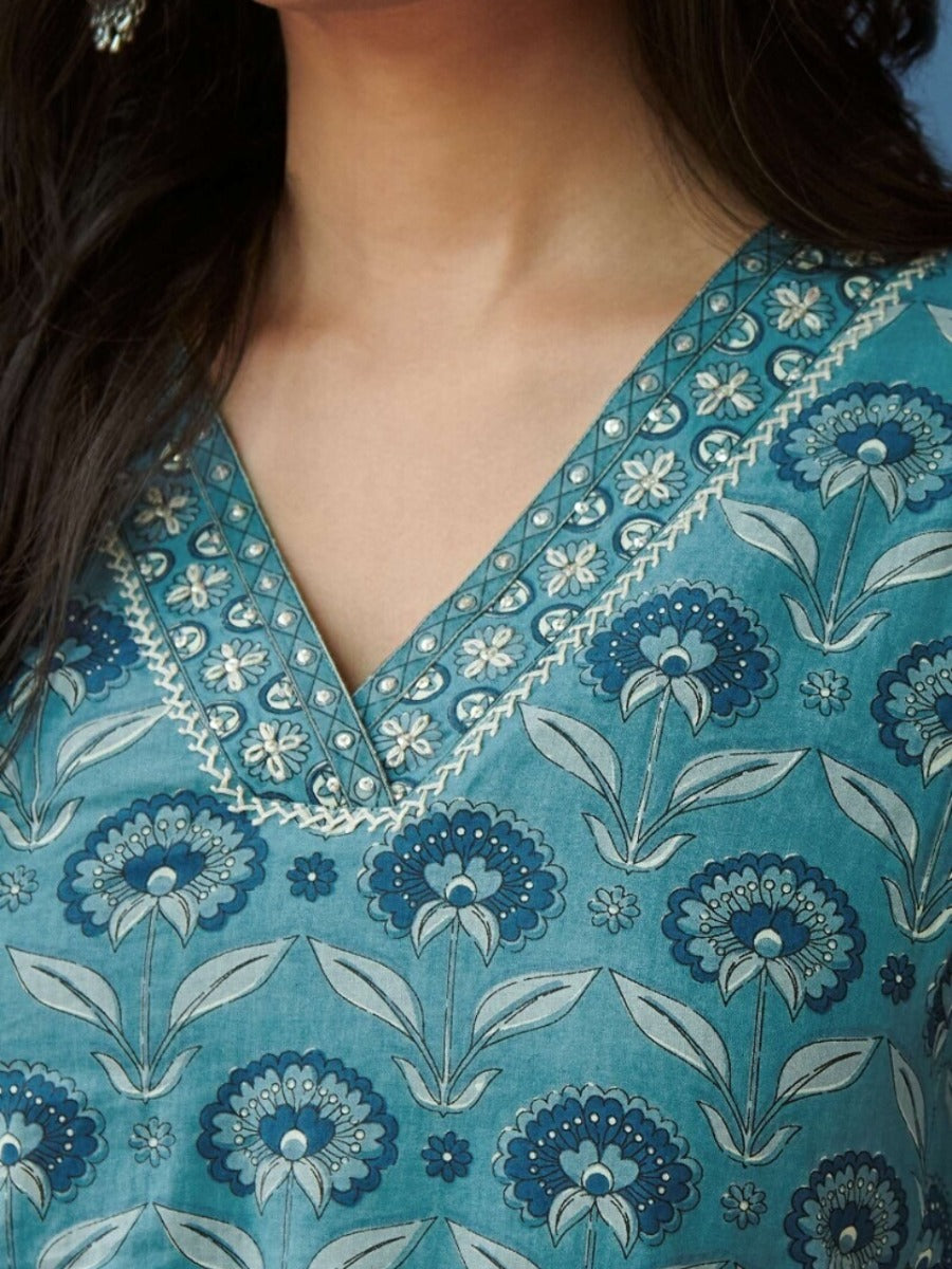 FlexFeb Elegant Sky Blue Cotton 3-Piece Suit Set for Women Printed Kurta with Coordinated Pants & Dupatta Lightweight Summer Ethnic Wear