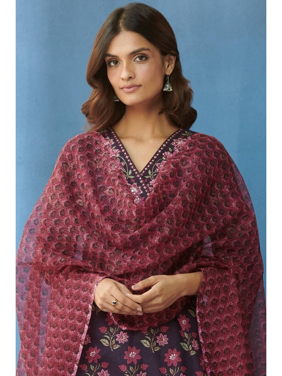 Graceful, vibrant, and rooted in timeless Indian aesthetics, the FlexFeb Pink & Blue 3-Piece Cotton Suit Set is designed for women who seek beauty in comfort. This stylish ensemble includes a navy blue floral-printed kurta, coordinated pants with a textured pattern, and a sheer pink net dupatta adorned with embroidered circular motifs.