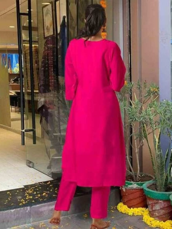 Add a vibrant touch of charm to your ethnic wardrobe with this stunning FlexFeb Viscose Rayon Pink & Blue 3-Piece Suit Set. Crafted from soft, flowy viscose rayon, this suit features a deep pink kurta with tasteful embroidery at the neckline, paired with matching bottoms and a captivating multicolor printed dupatta.